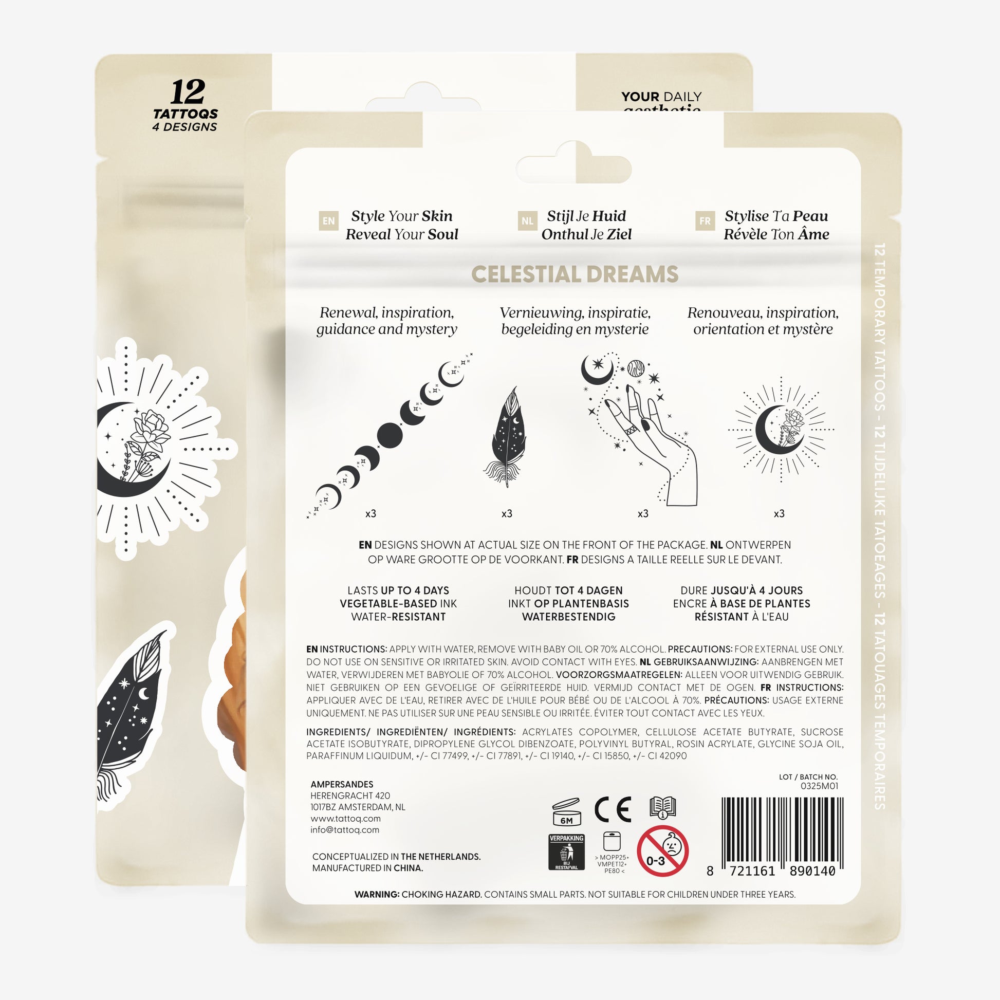 Each package includes 12 tattoos featuring four unique designs (three of each design), along with an instruction card and a meaning navigator to explore each design’s significance. Each tattoo lasts an average of two days when worn individually, offering up to 24 days of distinct skin art from a single pack.