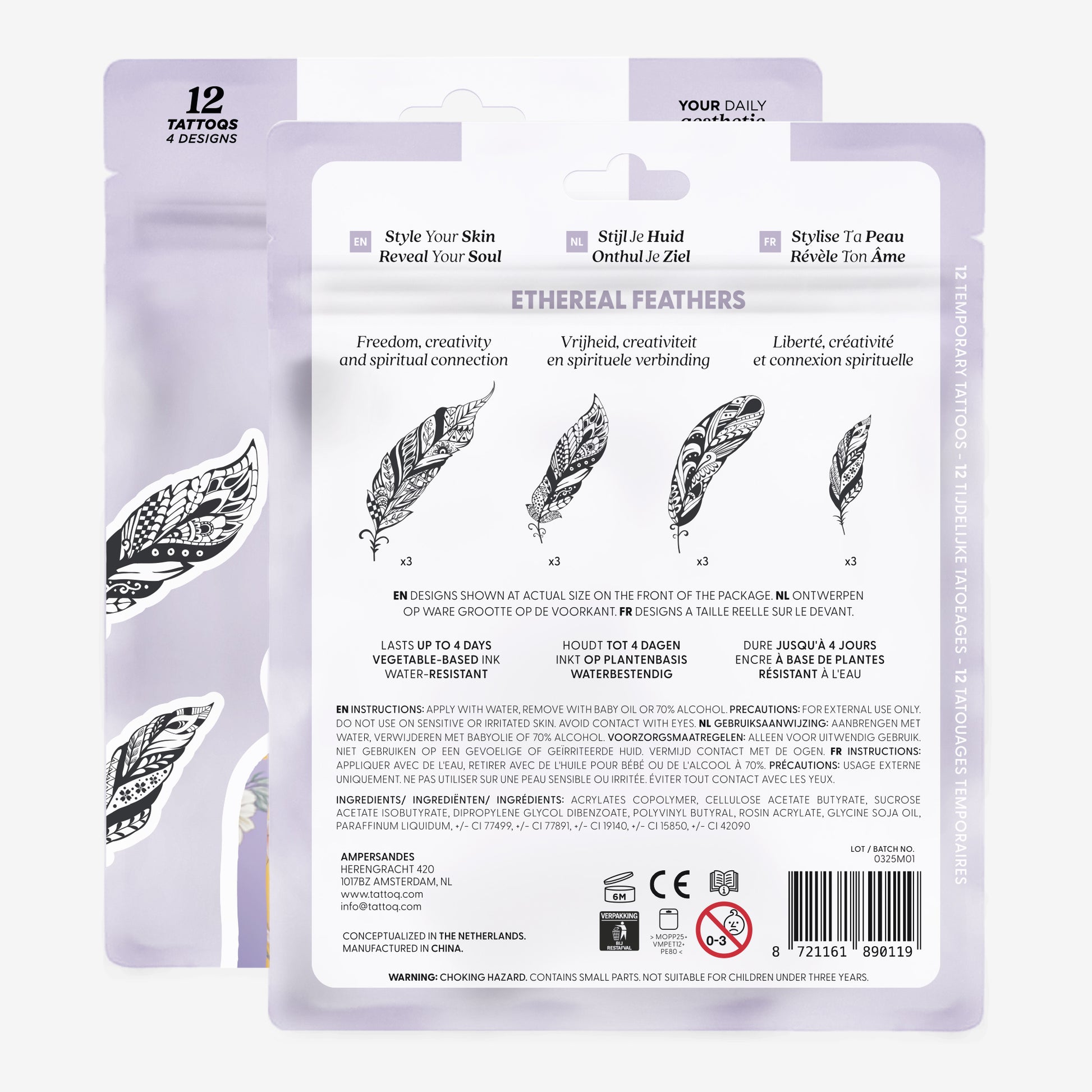 Each package includes 12 tattoos featuring four unique designs (three of each design), along with an instruction card and a meaning navigator to explore each design’s significance. Each tattoo lasts an average of two days when worn individually, offering up to 24 days of distinct skin art from a single pack.