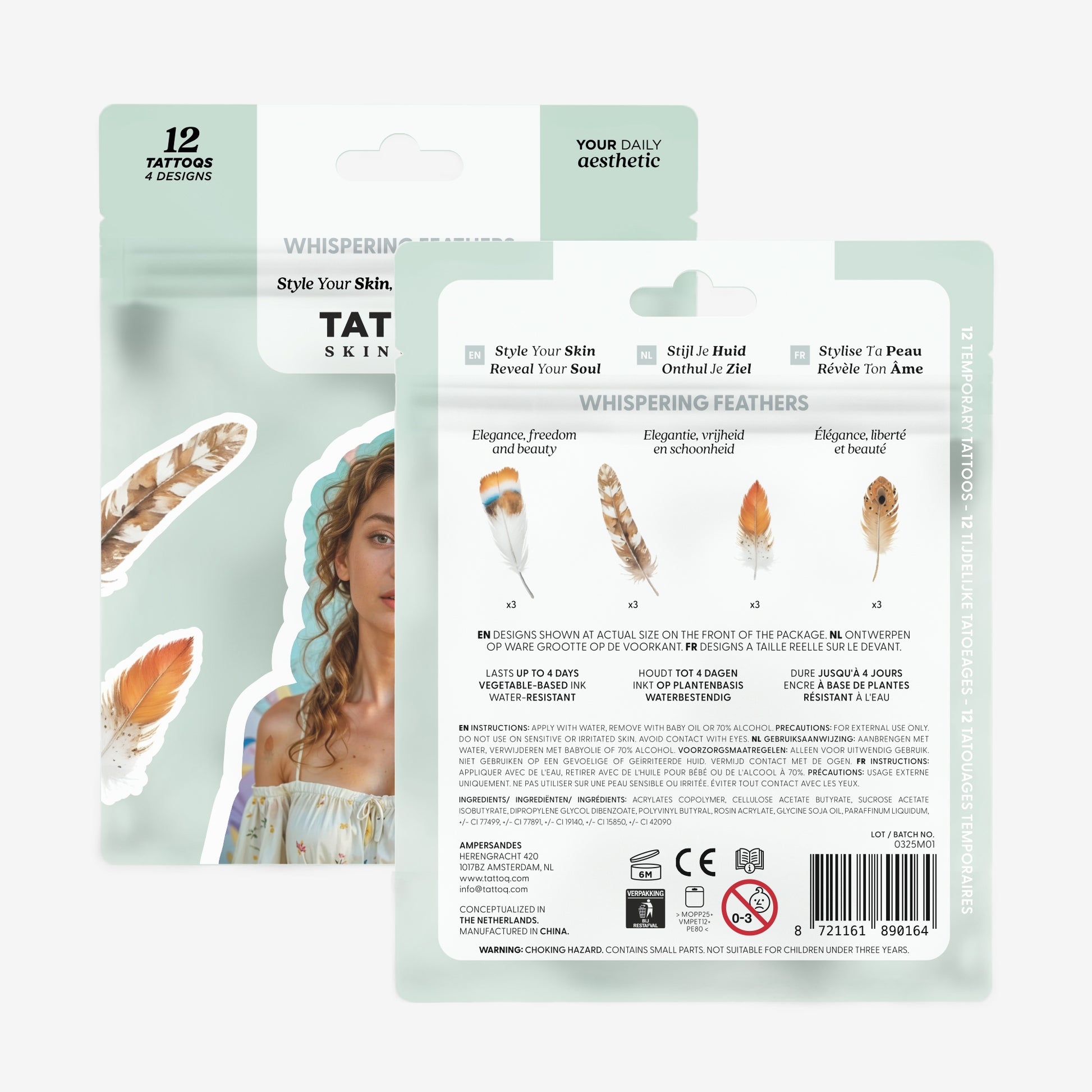 Each package includes 12 tattoos featuring four unique designs (three of each design), along with an instruction card and a meaning navigator to explore each design’s significance. Each tattoo lasts an average of two days when worn individually, offering up to 24 days of distinct skin art from a single pack.